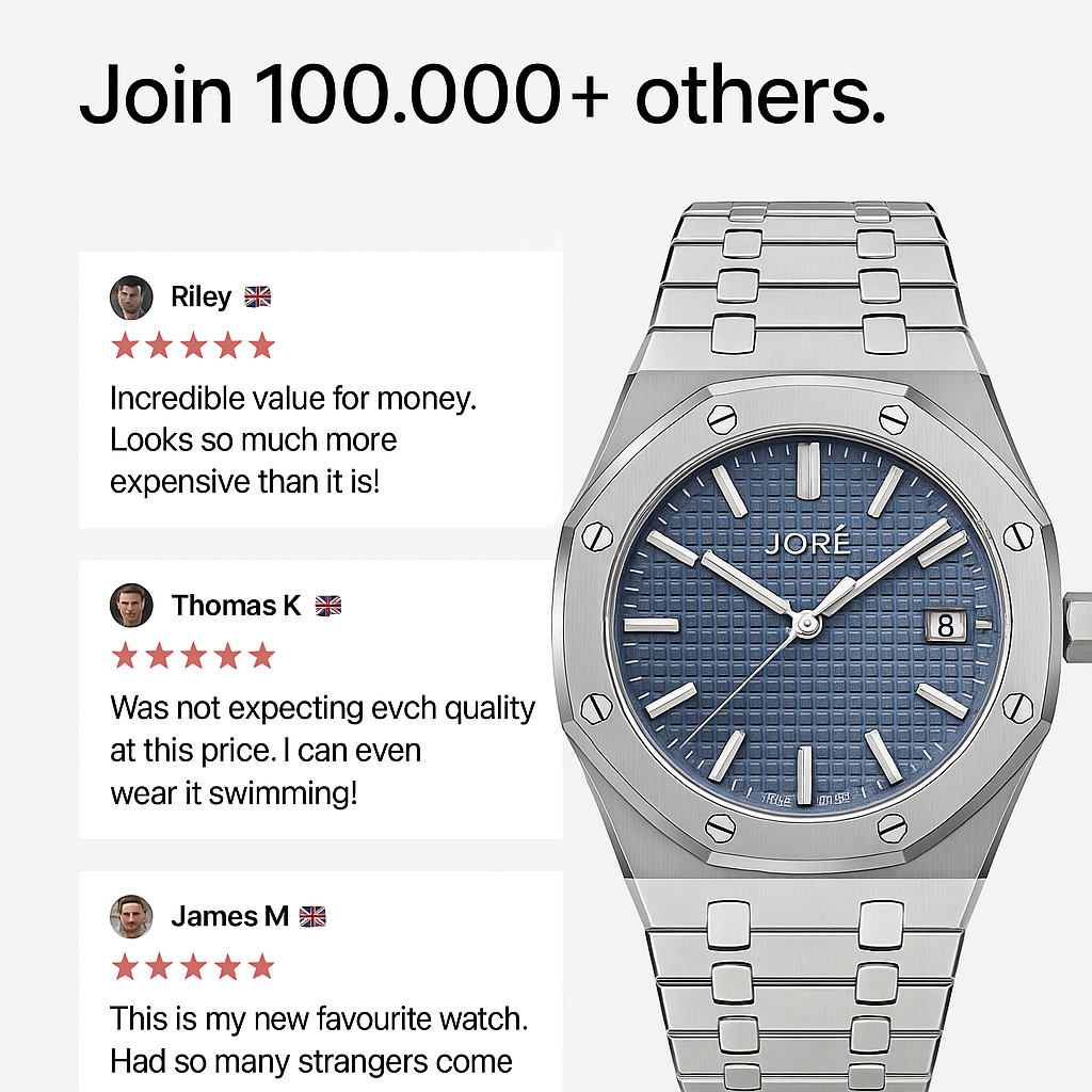 Luxury watch houses typically inflate prices 8–10x not for craftsmanship, but for branding. At JORÉ, we remove the prestige markup. You enjoy refined design and lasting quality without footing the bill for glossy ads, flagships, or celebrity endorsements.